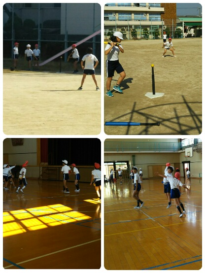 運動場では、1組がティーベースボールをしていました。支えの棒(ティー)に置いたボールを打ちます。ボールは止まっていますが、バットが空を切ることもあり、よく狙って打ちます。