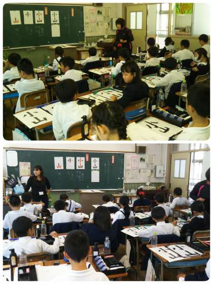 「小」の字を書きます。まず手本を見て書いてみます。書けたら、先生から字形の整え方のポイントを聞いて、自分の字と比べます。清書はうまく書けたかな。