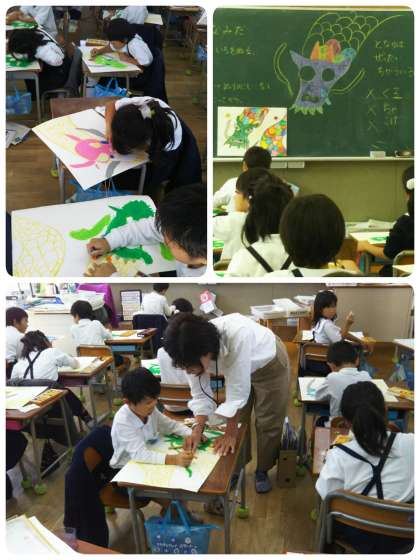 「りゅうの目のなみだ」の続きです。いよいよりゅうに色を付けていきます。それぞれの箇所の輪郭にあたるところをなぞるように塗ってから、中心部を塗ります。みんな一生懸命手を動かしていました。