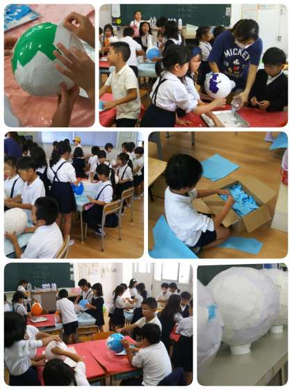 学年合同で工作「不思議なカラフルタマゴ」を作っています。1人がタマゴを持ち、もう1人が紙を貼り付けます。今日は2組の児童が支援に回っています。紙は3回ほど重ね貼りするそうです。
