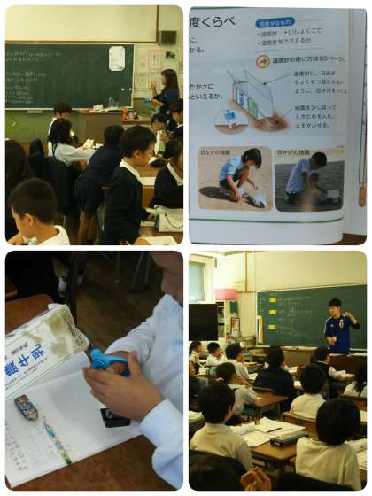 日なたと日かげの地面の温度の違いを調べる準備をしています。温度計の使い方と使うときの注意点を確認し、温度計に直接日光が当たらないようにするカバーを作りました。