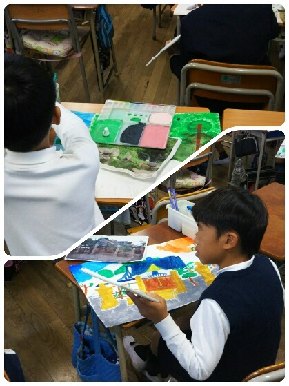 校舎や校区にある建物を題材に描いています。絵の具での色付けがずいぶん進み、間もなく作品が完成するようです。