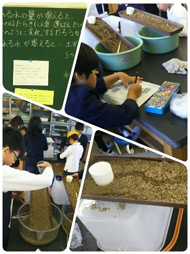 5年生が簡易装置を使って実験観察をしています。流れる水にはいくつかの働きがありますが、量が増えると、その働きが変わるかどうか調べます。予想したことと比べて、どうだったか、そこからどんなことが言えるか考えます。