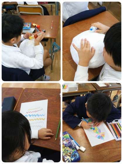 こちらは2年生です。不思議なカラフルタマゴの着色前に、紙がはがれているところを修復しました。そのあとは、用紙にタマゴのデザインを下描きしました。チェック模様にしたり、水玉にしたり、想像力を発揮していました。
