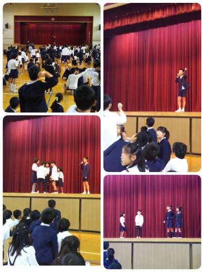 集会委員会の代表とじゃんけんをします。あいこや負けたら座ります。人数が少なくなったら、勝ちの凝った者で決勝戦をします。簡単なルールですが、おおいに盛り上がっていました。