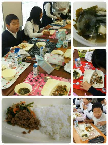 ひき肉・野菜、どれもが、食欲をそそる甘さを持っています。そして、甘くなった口をスープが洗い流すように通り過ぎていきます。主菜と副菜・汁物の相性ばっちりの給食です。