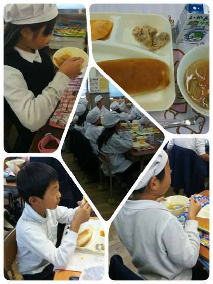 今日のパンは「おさつパン(さつまいもの蒸しパン)」でした。ちょうど今、1年生の学年掲示板にいもほりをテーマにした掲示がされていて、自分たちが掘ったいもが、(こんなふうに調理されるんだ。)と、思いを巡らせられたのではないでしょうか。