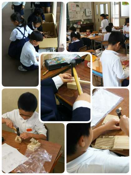 3年生が木切れと釘を組み合わせて工作をしています。中には、かたい板切れもあり、釘の打ち方にもちょっとしたコツが必要です。悪戦苦闘しながらも、子どもたちは一生懸命でした。