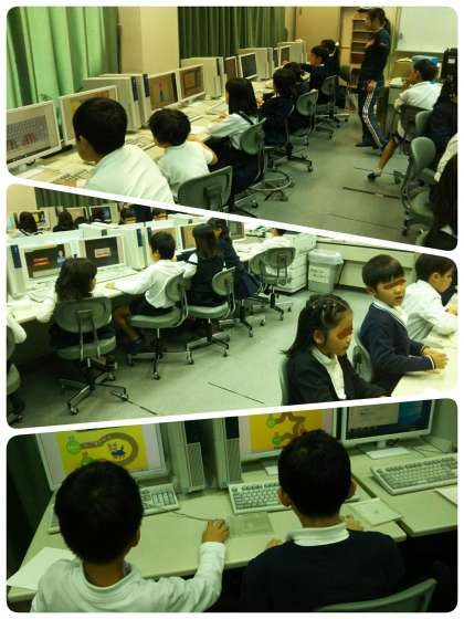 2年生がパソコン練習のソフトで、マウス操作やキーボード入力をしています。画面と同じアルファベットを探して打ち込むキーボード入力は、ちょっと難しそうでした。