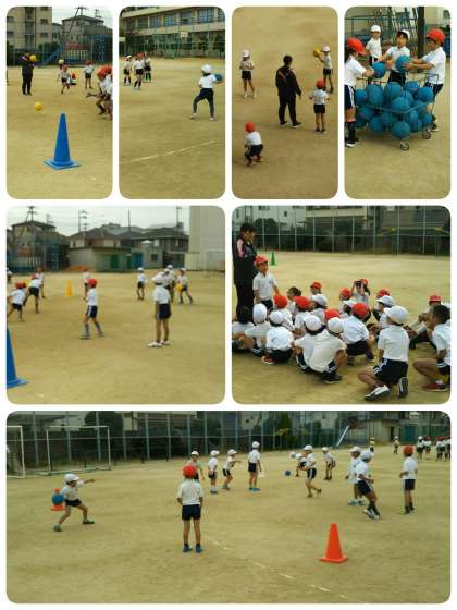 ボール運動です。転がしたり、バウンドさせずに相手手に投げたりします。しばらく練習したら、ドッジボール遊びをしました。