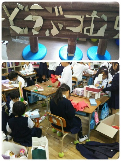 いよいよ今秋に迫った作品展。児童の作品とともに、各学年の看板や飾りものも姿を見せ始めました。