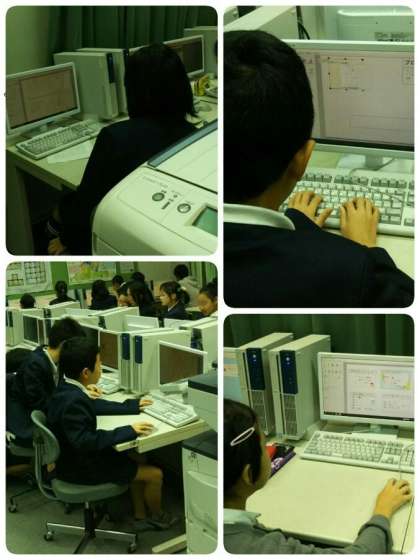 卒業文集のプロフィールのページを作っています。パソコンで罫線やイラストを取り込んで、きれいに仕上げます。