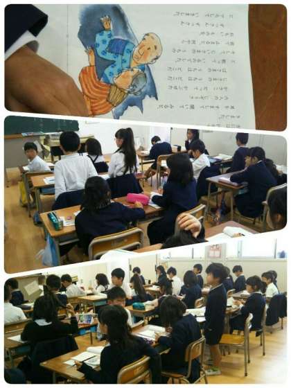 「かさこじぞう」の場面分けです。話の変わり目を探して発表しているところです。時間や季節が変わったと分かる言葉をヒントに、一生懸命考えました。