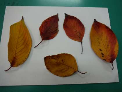 玄関の桜がきれいに紅葉しています。黄色、朱色、赤。グラデーションになっています。