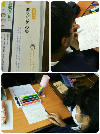 感謝の心を持って生活することは、豊かな人間性につながるのでしょうね。身の回りにある「ありがとう」を探し、気持ちを伝える手紙を書きました。