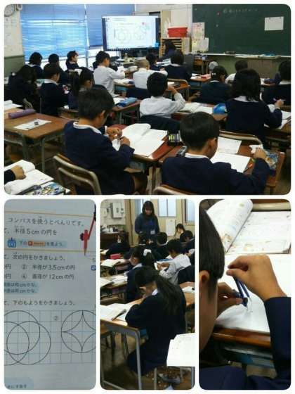 コンパスを使って、教科書と同じ模様を描きます。コンパスの針(円の中心)をどこに置けばいいのか、よく考えて描きます。