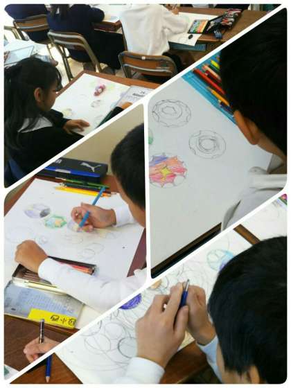 3年生が、コンパスを使って模様を描いていました。整然とした幾何学模様にしたり、何かのキャラクター風にしたり、複雑に線を重ね合わせたりしていました。