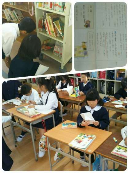 2年生が、おすすめの昔話を紹介する作文に取り組んでいました。学級文庫から本を持ち出し、内容を再確認して作文しました。
