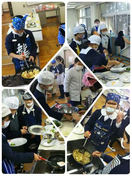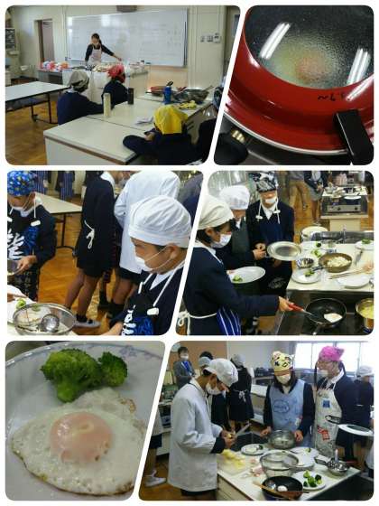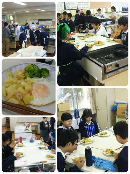 12月10日 調理実習 6年生 公開日 2019/12/10 更新日 2019/12/10 お知らせ 【ジャーマンポテト・目玉焼き・ブロッコリー】 じゃがいもを茹でて柔らかくし、ベーコンと一緒に炒めます。目玉焼きはよく焼いたり、やや半熟に近い状態にしたり、好みで調整します。 手順をよく見通して調理する学習です。6年生児童は、手際よくできていたように思います。