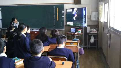 映像資料を見て、なわとびの技とコツを調べています。「百聞は一見に如かず」のことわざがあるように、見ることでイメージトレーニングになり、コツをつかみ易くなります。