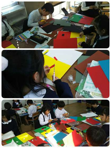 1年生が、色ボール紙でお面を作っています。お面の台紙に、折り紙などを切ったものを貼り付けて、好みのお面にします。作っていくうちに飾りがどんどん増えて、にぎやかになるのでしょうね。