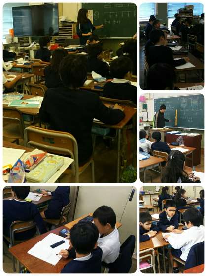 分数の大きさを読み取ったり、足し算の基本ルールについて、近くの席の子と考えを伝え合ったりしています。