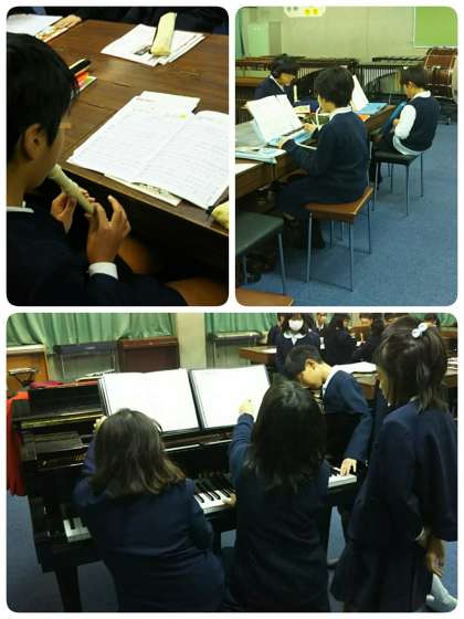 5年生です。音楽室で「威風堂々」の個人練習をしています。自分のパートを一生懸命練習しています。