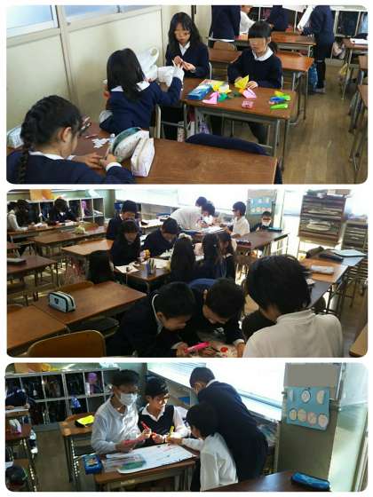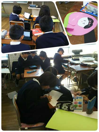 2学期も終わりに近づき、3年生と5年生がお楽しみ会を計画しています。クイズや人形劇などで、楽しい催しにするための準備をします。5年生はタブレットを使って、クイズの問題づくりのヒントを探していました。