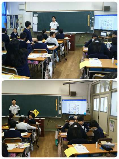 英語の自己紹介クイズです。5年生児童が自己紹介を英語で書き表し、誰のことが書かれているか当てます。照会文が読まれるたび、(あの子かなあ。)と、周りを見回します。