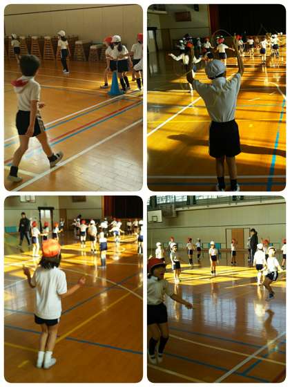 1年生が講堂で体育をしています。ランニング後に少し歩いて息をととのえたら、なわとびにチャレンジです。前まわしや後ろ回しで連続して跳べるよう、がんばっています。