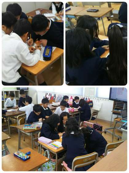 係活動の掲示カードを作成しているところです。メンバーの名前やどんな仕事をするのかといったことをかいて、紹介します。