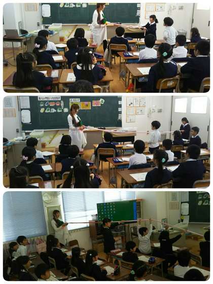 野菜に含まれるビタミンや食物繊維は、腸の働きを調えます。模型を使って、実際の腸の長さを見せてくださいました。あまりの長さに驚きの声が上がりました。