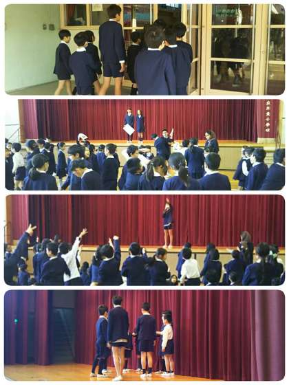 チャイムが鳴り、児童が講堂に集まります。