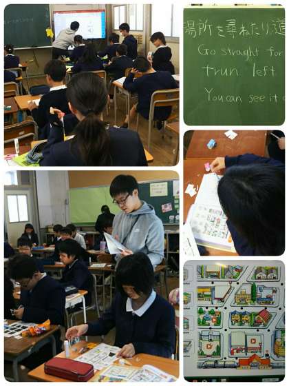 「まっすぐ進んで右に曲がり、まっすぐ進むと左手に見える建物は何。」と、英語で問われます。デジタル教科書の音声をよく聞いて答えます。
