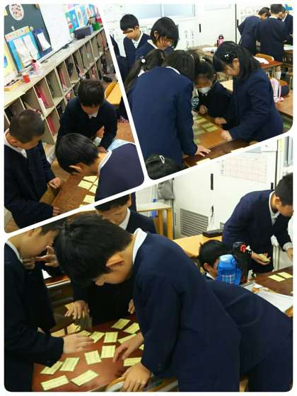 4年生が今日も百人一首をしていました。札を取るのが、だんだんはやくなっています。