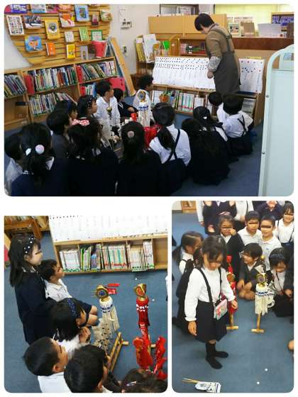 以前2年生に紹介していただいた旗源平を1年生でもやってみました。「うめがいち(一番良い点数)」「かんかんど(一番低い点数)」と、それぞれのチームがかけ声をあげます。点数(旗)の移動は、図書館補助員さんが手助けしてくれます。元気な声が校舎に響きました。