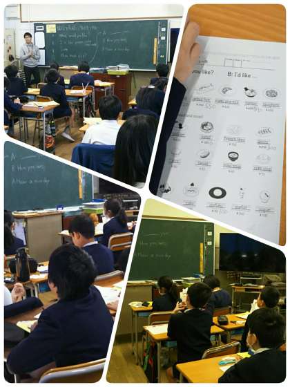 5年生の英語学習です。お店で好きな食べ物を伝え、その値段をたずねる表現を学習しています。
