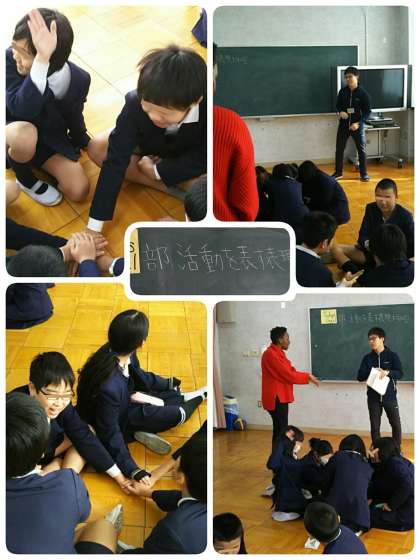 中学校生活を少し意識する、部活動の表現です。今日のキーワードゲームは、グループで各自の手を重ね合わせ待機します。キーワードの部活動名が出たら、鬼役が手を振り下ろします。手を重ね合わせている側は、たたかれないように素早く手をどけます。緊張感漂うゲームです。