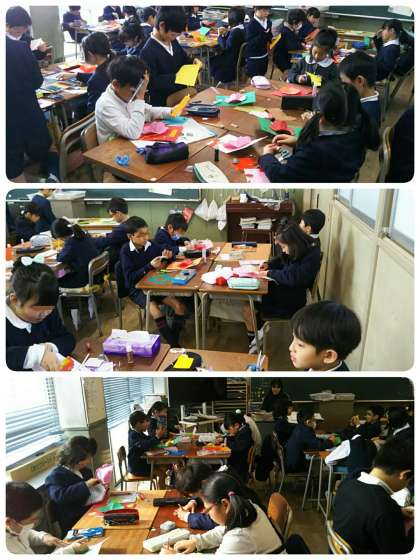 3年生が、卒業する6年生にお祝いや感謝のメッセージカードを作っています。陰になり、日なたになり川北小学校をひっぱってきた6年生に感謝です。