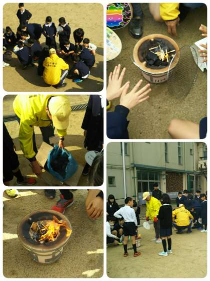 昔の道具を体験します。3年生が自分でマッチを擦って、火をおこします。うちわで空気を送るのですが、みんなが一斉にあおぐので、火の勢いが弱まってしまうこともありました。点火・火の管理にドキドキしました。