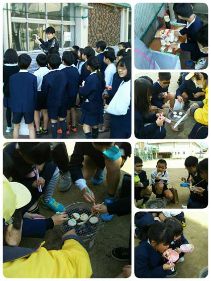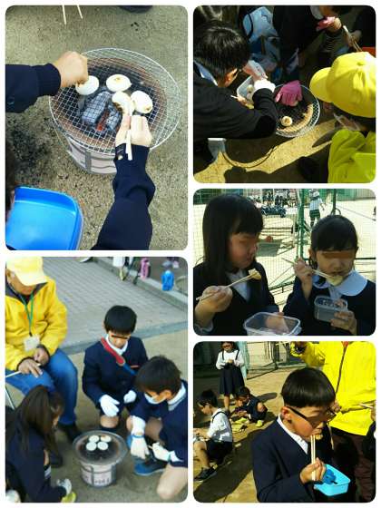 火おこしの次は、もちを焼きます。炭の力でしょうか。もちは、すぐにぷくっとふくれます。先生にしょうゆを入れてもらって食べました。しょうゆをつけてもう一度焼くと、香ばしい匂いが漂いました。