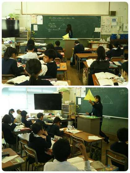 3年生の算数です。今日は、二等辺三角形や正三角形の角の大きさについて調べています。三角形にある3つの角の大きさについて、何か言えることはあるでしょうか。紙を二等辺三角形や正三角形に切り取って、比べてみます。
