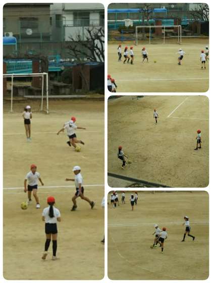 体育科でサッカーをしています。対戦の順番が来るまで、少人数でボールを蹴って練習をします。