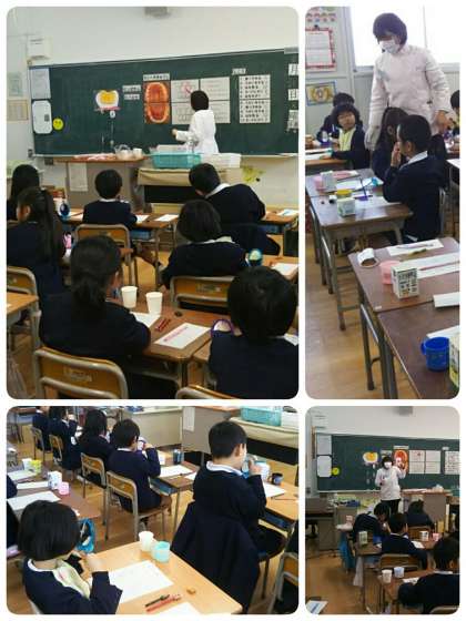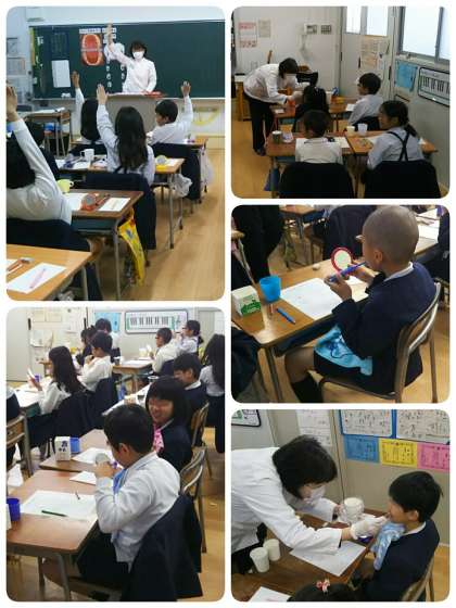 歯科衛生士さんによる歯みがき指導です。歯垢を見やすくする薬品を歯に塗ってもらい、自分の歯の汚れ具合を知ります。次に、ブラシで歯を磨いて、もう一度薬品を塗ってもらいます。歯がきれいになっていたら、磨き方が上手ということになります。細かく丁寧に磨いて、歯を大切にしたいです。