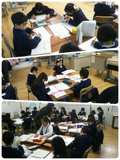 国語科で、教科書のさし絵を参考に、場面ごとの内容にあう絵を描いて、紙芝居を作っています。同じ場面を選んでいても、絵にするとひとりひとり個性が出ることでしょうね。