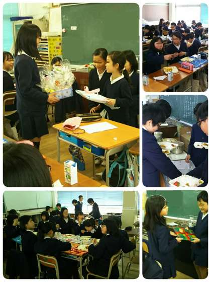 卒業を祝う会ができなくなったため、給食時間に1年生から5年生の代表児童が6年生の教室にプレゼントを届けてくれました。