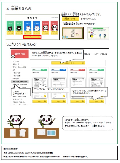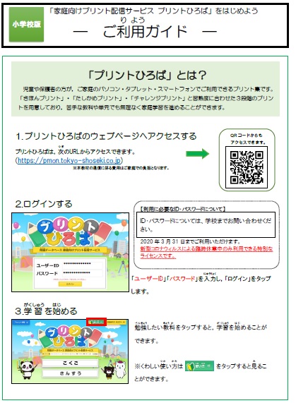 必要なご家庭は「学校ホームページ →緊急配付 →家庭学習プリント」をクリックしていただき、「ご利用ガイド」を参考にご活用ください。