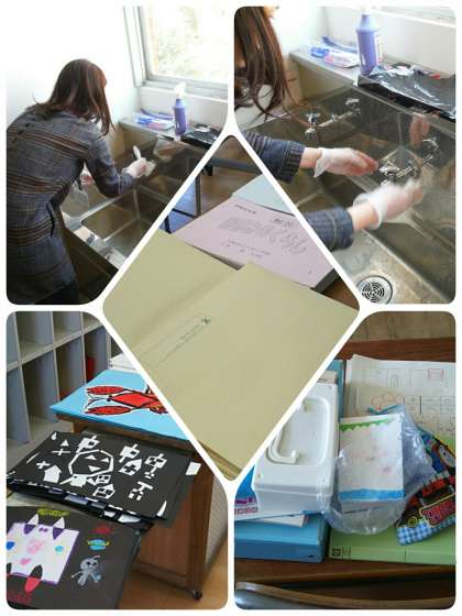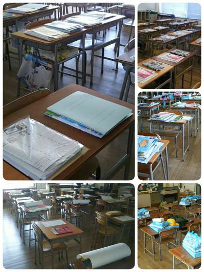 子どもたちがよく触れるところを中心に消毒したり、返却物や配りものをまとめて個人の机上に置いたり、登校日に向けて準備をしています。