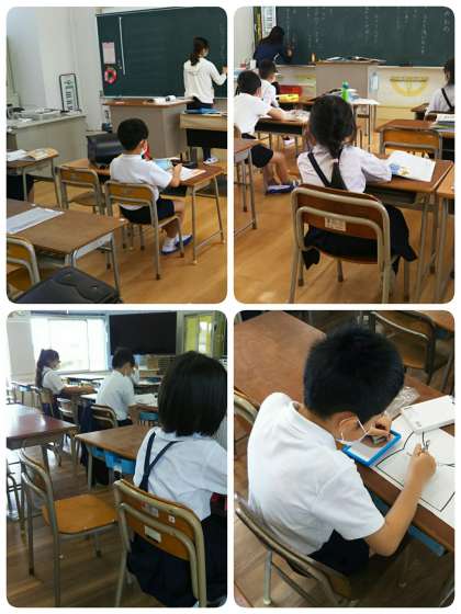 4年は自己紹介カードをつくっていました。顔の部分は、手鏡を見てかきます。