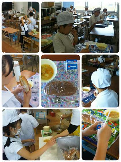 後半グループが登校してきました。荷物を整理したら、給食の準備をします。 【牛乳・こくとうパン・スープ】